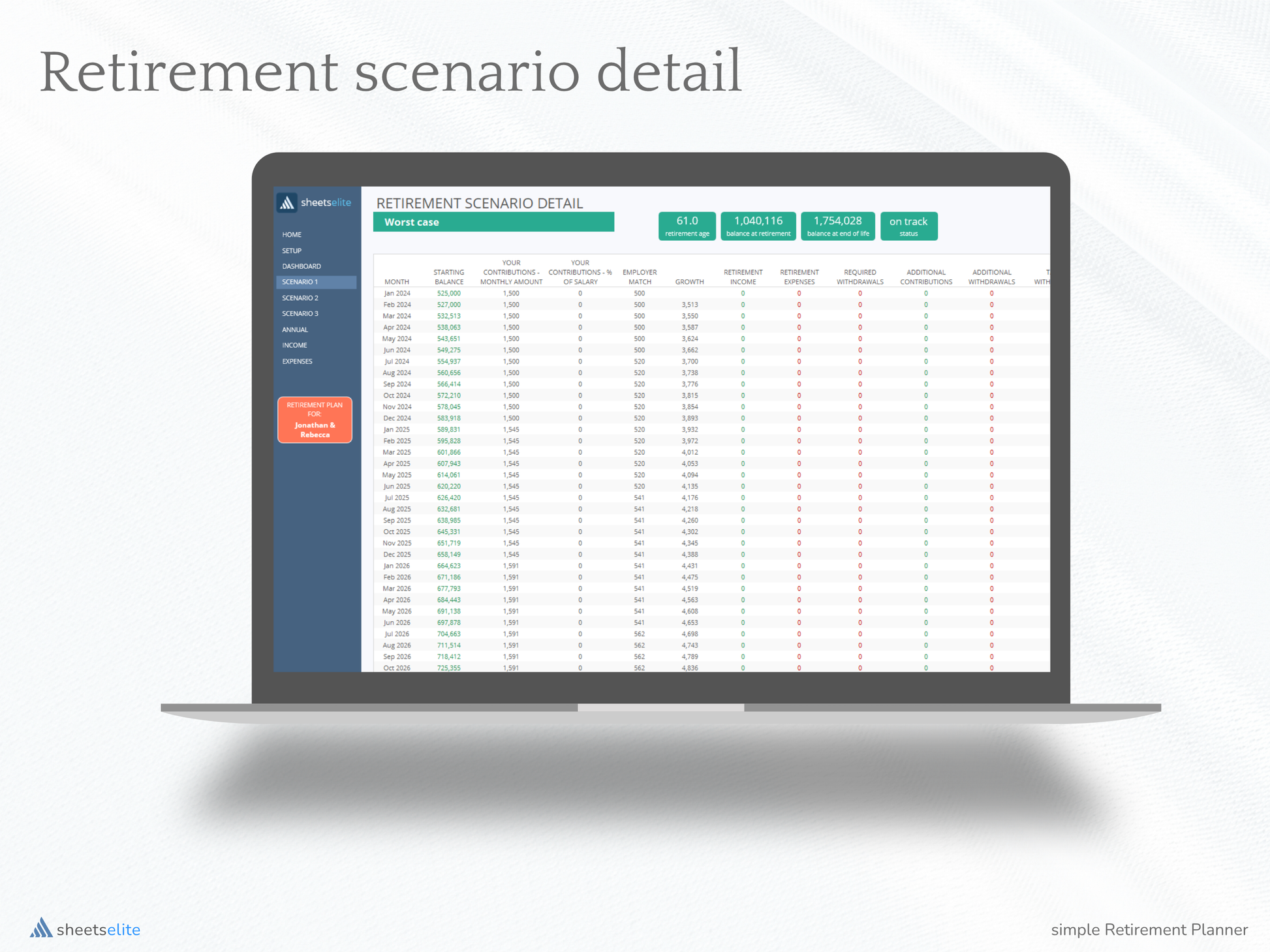 Retirement planner that provides a lifetime projection of retirement fund balances, income during retirement, expenses during retirement, and inflation adjustments using 3 custom scenarios. This template provides everything that you need to ensure a comfortable retirement. Each scenario allows you to compare various assumptions including retirement contributions, company match, interest/growth rates, target retirement dates and more.